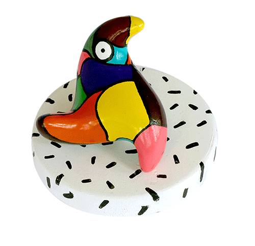 Handmade with polyester modeling paste, ceramic and acrylic painted wood. 10 cm high